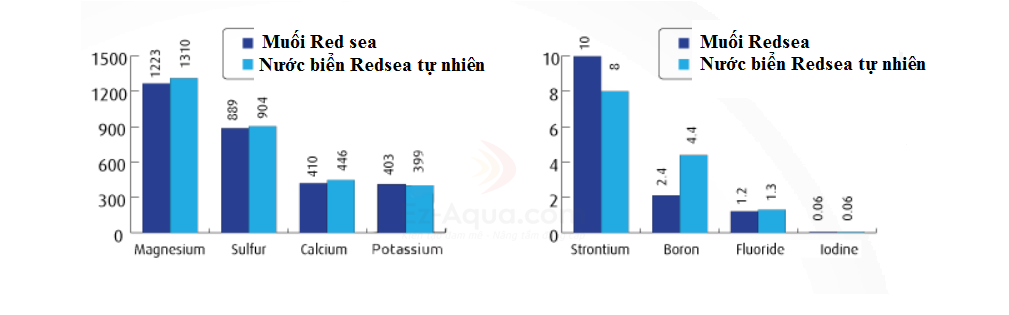 Biểu đồ so sánh về nồng độ của muối Redsea Salt với nước biển Redsea tự nhiên ở độ mặn 33 ppm :